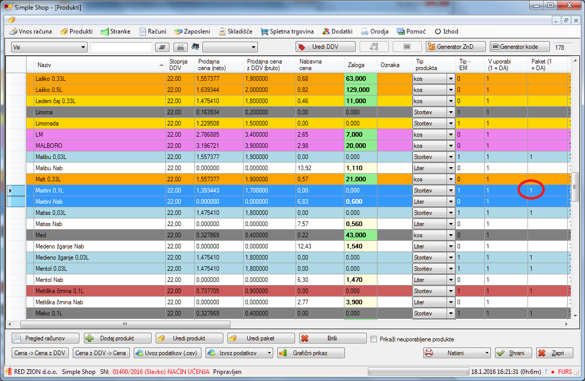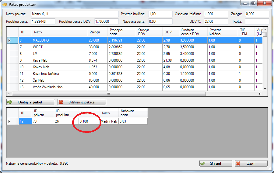Pri prvi prodaji blaga v paketu se postavi zaloga nabavnega artikla na 0 zalogo v produktih pa pravilno odšteje.