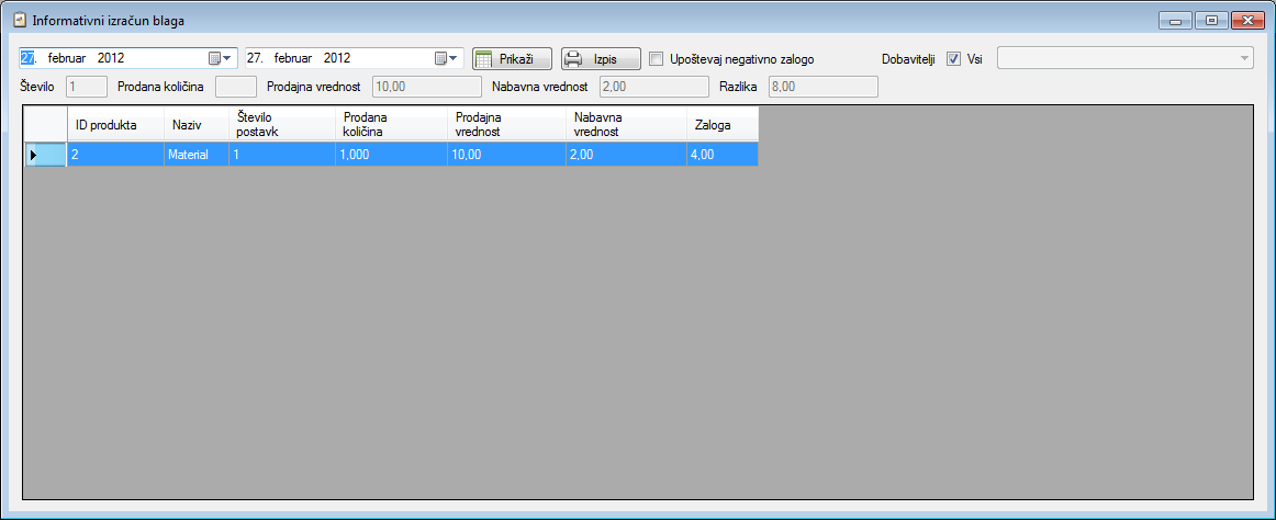 Informativni izračun blaga se uporablja za dnevni, mesečni, letni ali poljubni pregled izdanega materiala preko izdanih računov.