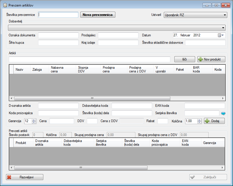 Prevzem artiklov se uporablja za prevzem artiklov na podlagi prejetih dobavnicah ali računih.