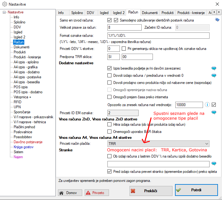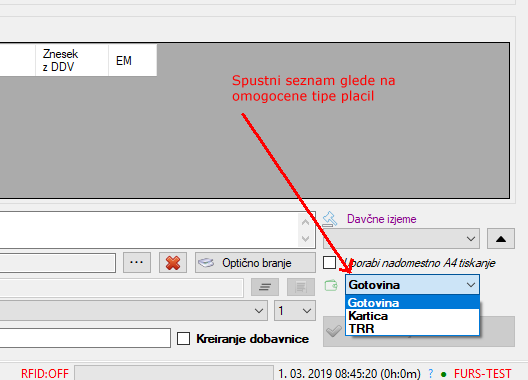 V nastavitvah se naj dodela, da je mogoče v formi Vnos računa A4 ter v vseh ostalih A4 formah imeti možnost izbire plačil samo za te, kateri so omogočeni v nastavitvah (privzeto omogočeni vsi trije tipi plačil).