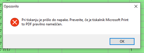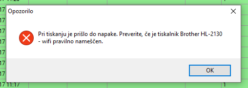 Pri tiskanju prevzemnice pride do napake.