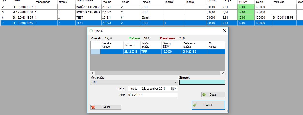 Nova funkcija "dodaj plačilo" ne deluje kot bi morala.
